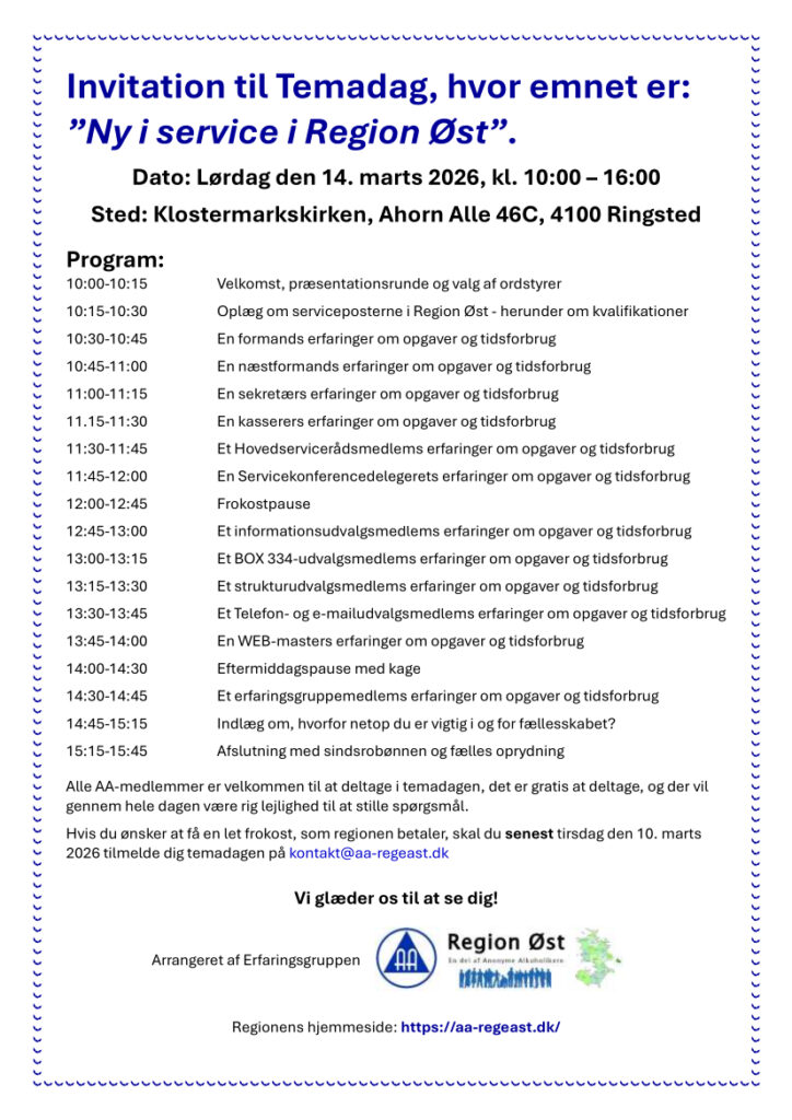Region Øst inviterer til Temadag lørdag den 14. marts 2026, kl. 10:00-16:00, som alle AA-medlemmer er velkommen til at deltage i.
